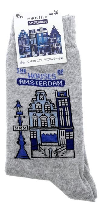 Grijze sokken versierd met Amsterdamse grachtenhuisjes in het blauw.