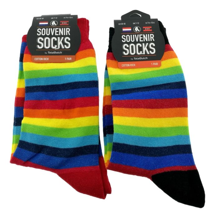 Deze geweldige sokken hebben een design van strepen in alle kleuren van de regenboog. Voor wie niet kan kiezen: Regenboog sokken met zwarte teen, en regenboog sokken met een rode teen.