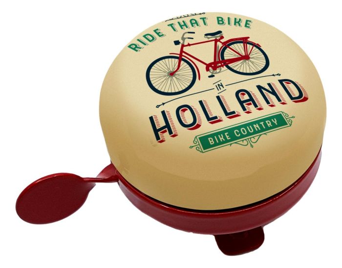 Tring! Tring! Met 25 miljoen fietsen in Nederland, is Nederland echt een fietsland. Deze typisch Nederlandse gele/rode fietsbel is versierd met een rode fiets op een gele gekleurde achtergrond. Op de fietsbel staat: "Ride that bike" en "Hollandbike city". Deze fietsbel is heel geschikt om als souvenir te geven aan fietsers uit de hele wereld!