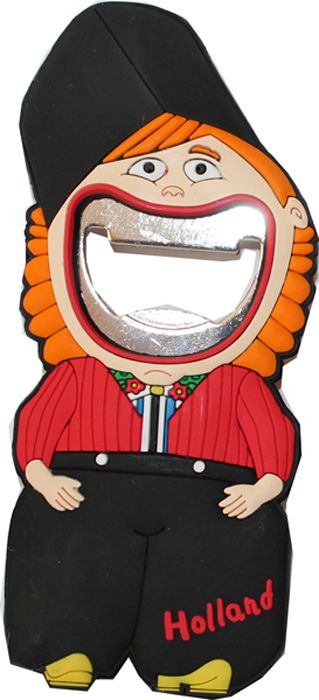 Flesopener Mr. Volendam, kan ook weggehangen worden als koelkastmagneet. Hoog 13,5 cm.Nooit meer de opener kwijt zijn, je plakt hem gewoon op de koelkast, het is ook een magneet.