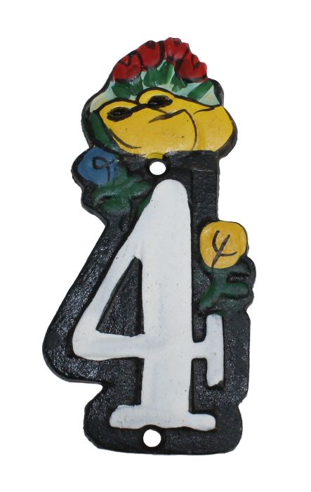 Stevig gietijzeren huisnummer versierd en beschilderd met een Nederlands thema. Onderdeel van een serie van 10 verschillende huisnummers. Het huisnummer is ongeveer 11cm hoog, en 6cm breed. Het gewicht is ongeveer 130 gram.