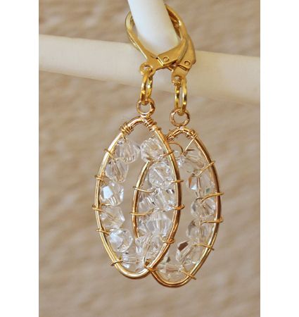 Set lange druppel oorbellen, lengte 31x16mm aan roestvrij stalen goldplated oorhangers. Kleine bicone kristal kralen, omwonden met goldplated draad. De roestvrij stalen oorhangers zijn allergie en nikkel vrij.