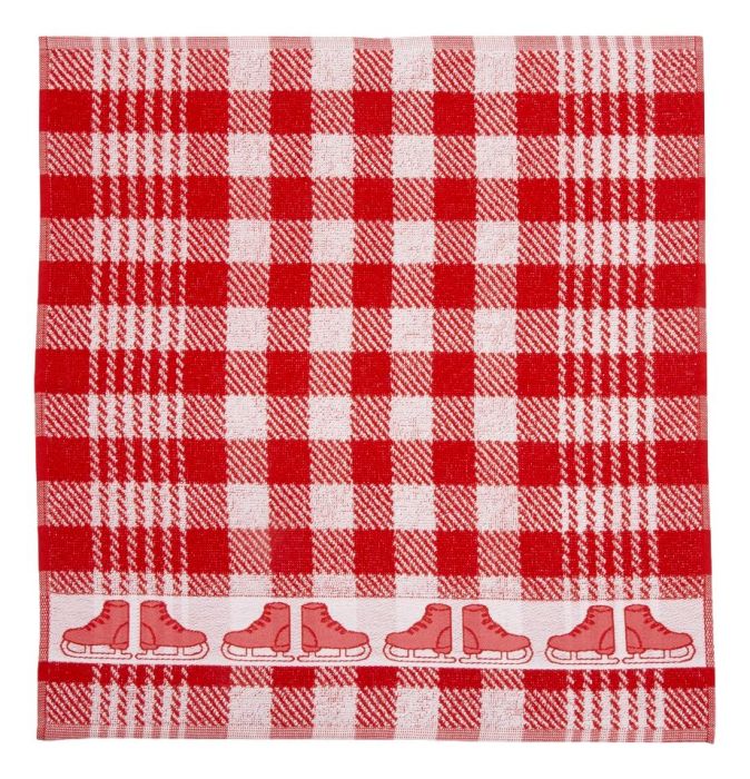 Mooie stevige rood/wit geruite keuken handdoek met typisch Nederlandse schaatsen.