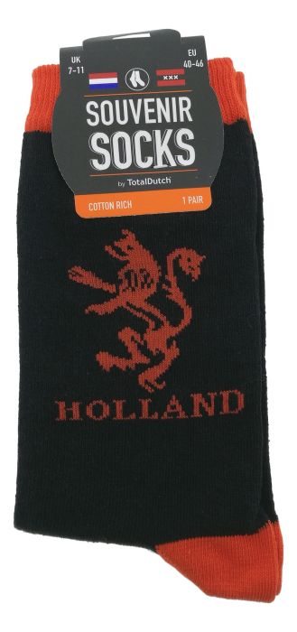 Zwarte sokken die versierd zijn met de een oranje leeuw en de tekst "Holland".