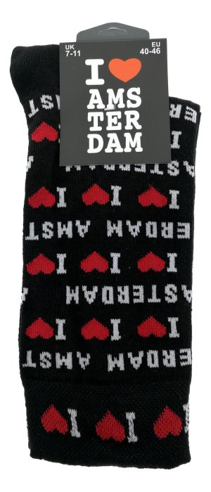 Zwarte sokken versierd met de tekst "I ❤ Amsterdam", met rode harten.