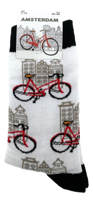 Wit met zwarte sokken die versierd zijn met Amsterdamse grachtenhuisjes en fietsen.
