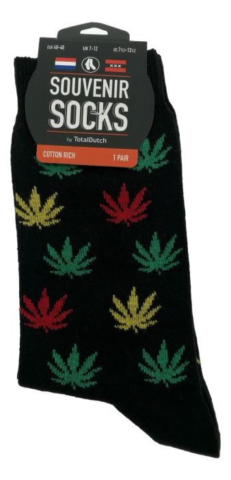 Voeg een flinke dosis vrolijkheid toe aan jouw sokkencollectie met deze unieke zwarte wietsokken! Deze sokken met de iconische gekleurde wietbladeren in de kleuren rood, groen en geel zijn niet alleen super stylish, maar ook erg comfortabel.