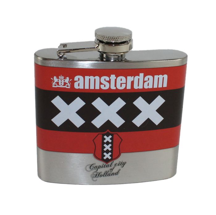 Heupflesje met het rode wapen van Amsterdam, de drie kruizen en de tekst "Capital City of Amsterdam". Het heupflesje wordt geleverd in een kartonnen geschenkdoosje.