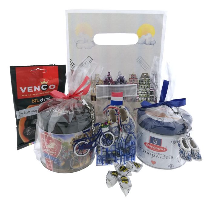 Deze geschenkset combineert drie Hollandse smaken: drop, stroopwafels en hopjes. Op deze manier krijgt een complete kennismaking met deze typisch Nederlandse lekkernijen.