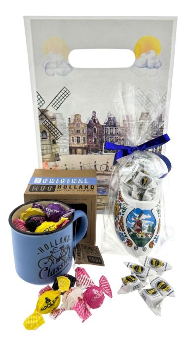 Verwelkom iemand in Nederland met dit lekkere typisch Nederlandse geschenk ! Een Nederlands koffiekopje gevuld met lekkere fruitsnoepjes, en een houten klompje gevuld met Haagse hopjes geven dit cadeau een echte Nederlandse uitstraling.