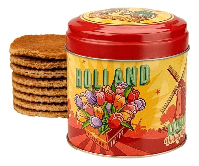 Mooi versierd sier stroopwafel blik met tulpen, molens en tulpenvelden.