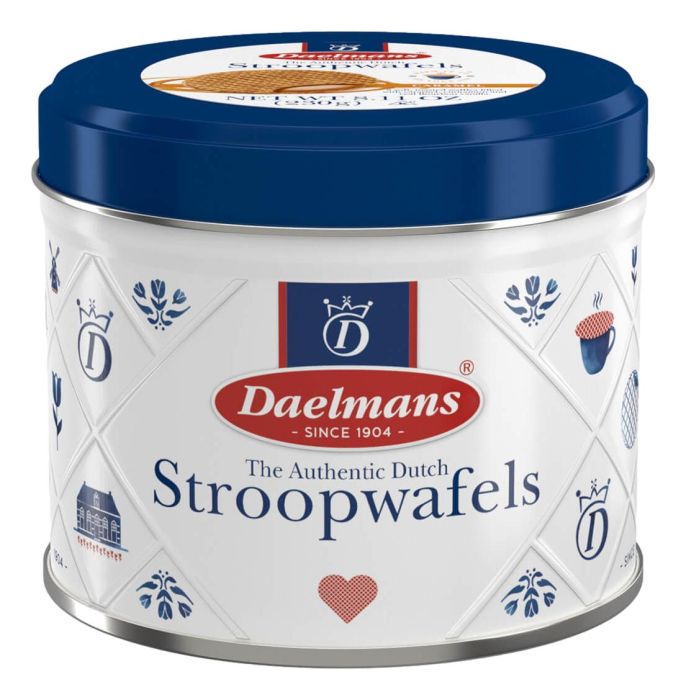 Onze Daelmans stroopwafels hebben een diameter van 8 cm en zijn gevuld met een zachte roomboter stroopvulling verrijkt met natuurlijk Bourbon vanille. De stroopwafels zijn verpakt in een Delfts blauw blikje met Hollandse taferelen op tegeltjes.