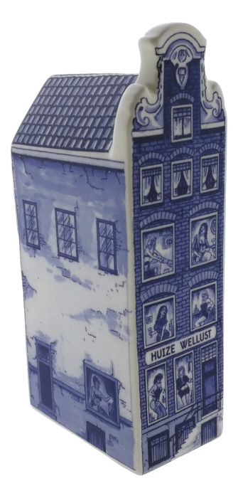 Keramiek huisje in Delfts blauw dat een gebouw aan de oudezijdsvoorburgwal laat zien uit de 18e/19e eeuw. Dit pand bevindt zich midden in het oude Amsterdam.