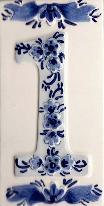 Tegel met delfts blauw huisnummer 1. De maat van de tegel is 15x7,5cm.