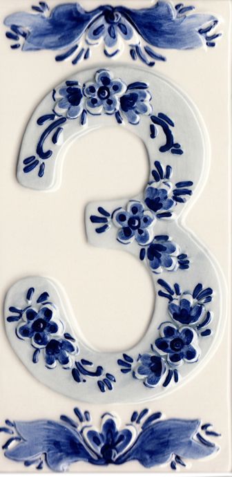 Tegel met delfts blauw huisnummer 3. De maat van de tegel is 15x7,5cm.