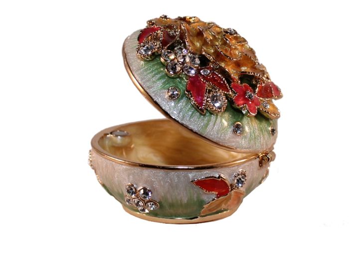 Prachtig rond doosje, zacht groen gekleurd, helemaal bezet met roosjes van Swarovski half edelstenen.