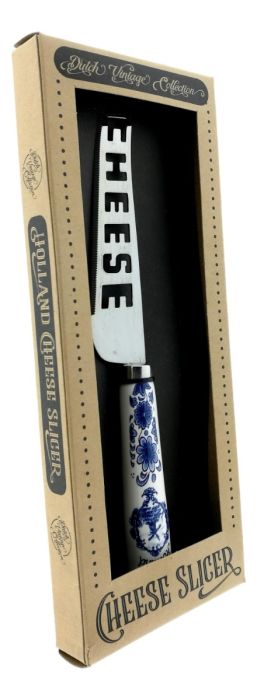 Kaasmes met een typisch Nederlands handvat, versierd met een Delfts blauw molen thema. In het mes staat de tekst "Cheese".