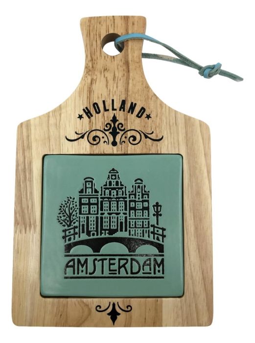 Deze kleine houten kaasplank is versierd met een groene keramische tegel met daarop Amsterdamse grachtenhuisjes.