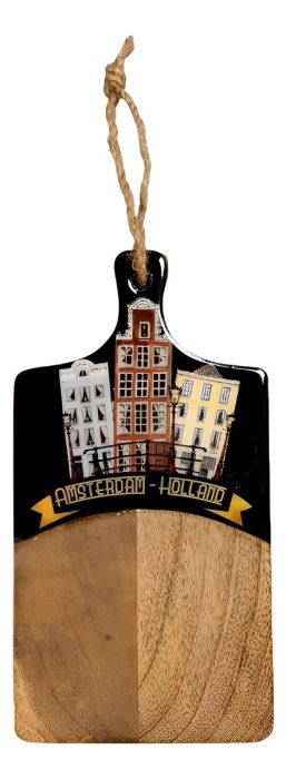 Een elegant zwart versierd kaasplank, die mooi zal afsteken tegen een geel stukje kaas. De bovenkant is versierd met Amsterdamse grachtenhuisjes en de tekst "Amsterdam-Holland".