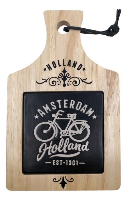 Deze kleine houten kaasplank is versierd met een zwarte keramische tegel met daarop Amsterdamse grachtenhuisjes.