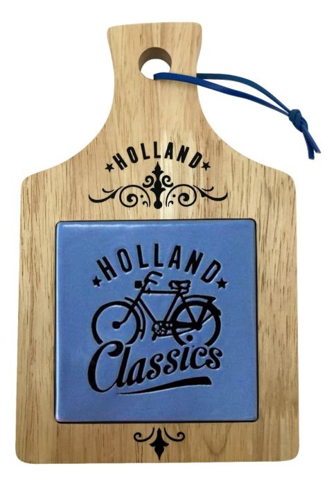 Deze kleine houten kaasplank is versierd met een marine blauwe keramische tegel met daarop een Hollandse fiets.