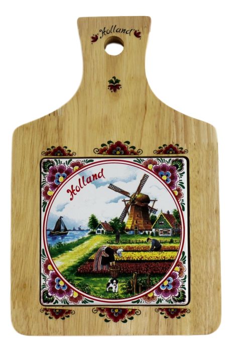 Kleine kaasplank gemaakt van hout met daarin een keramiek tegeltje van een Hollands landschap. Een kaasplank wordt gebruikt om een stukje kaas op snijden en/of op te dienen. De kaasplank meet 22 cm bij 15 cm. Het tegeltje is 10 cm bij 10 cm.