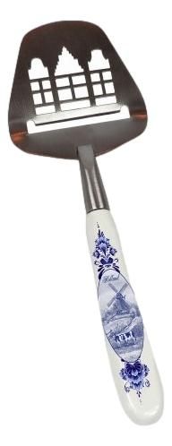 Kaasschaaf met een delfts blauwe molen op het keramieke heft. Het schaafblad heeft een uitsnijding in de vorm van typisch Amsterdamse grachtenpanden. Afmeting: 23 cm lang