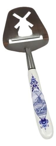 Kaasschaaf met een delfts blauwe molen op het keramieken heft. Het schaafblad heeft een uitsnijding in de vorm van een typisch Hollandse windmolen. Afmeting: 23 cm lang