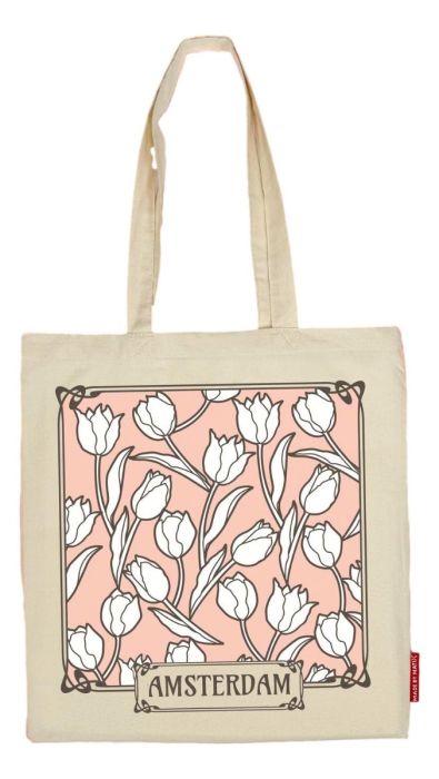 Mooie draagtas versierd met de witte tulpen op een roze achtergrond en de tekst "Amsterdam" daaronder.