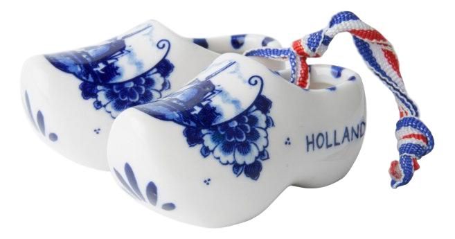 Setje van twee keramieken klompjes, verbonden met een rood/wit/blauw lintje. De klompjes zijn 7cm lang, 3 cm breed en 3cm hoog.