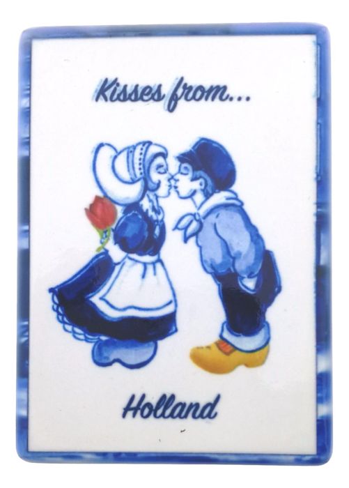 Deze keramieken koelkastmagneet is versierd met een tekening van een kussend boeren paartje.