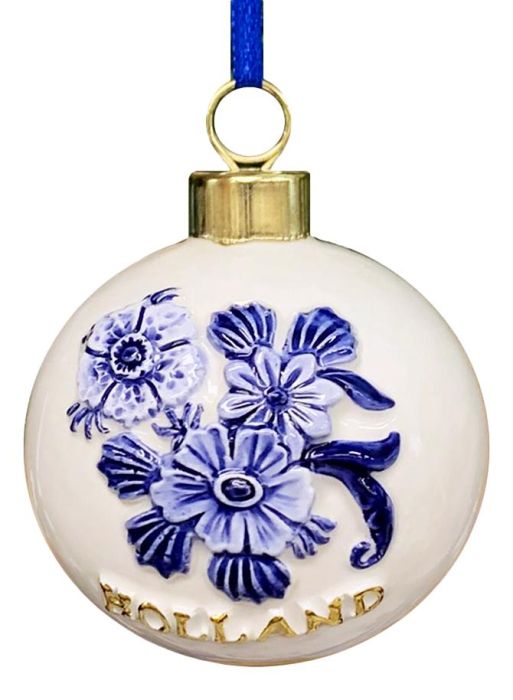 Deze kleine kerstbal is versierd met een Delfts blauwe bloemen en klein de tekst Holland in goud kleur. De bloemen zijn in reliëf aangebracht, waardoor de kerstbal een driedimensionale uitstraling heeft.