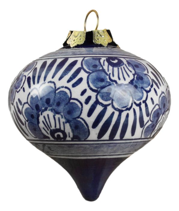 Deze tolvormige Delfts blauwe kerstbal is handgeschilderd en versierd met bloemen.