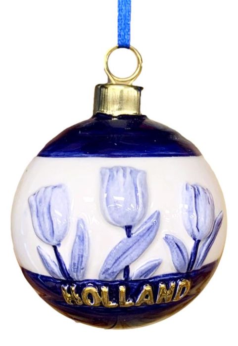 Kleine kerstbal met het Hollandse Tulpen, in 3D relief op een kerstbal. In mooie delfts blauwe kleuren, en met goud kleur versierde tekst "Holland" en een blauw lintje.