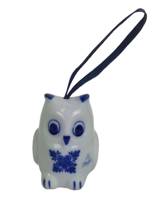 Delftsblauw porceleinen uiltje met donker blauw lintje om aan de kerstboom te hangen.