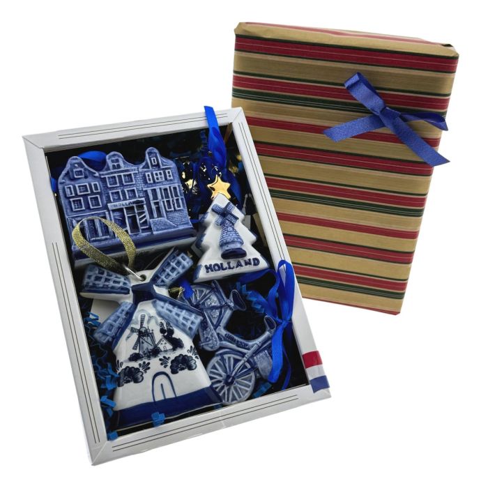 Mooi cadeau verpakte geschenkdoos met daarin vier typisch Nederlandse keramieken kerstboom versieringen. Deze geven een heel Nederlands tintje aan de kerstboom !