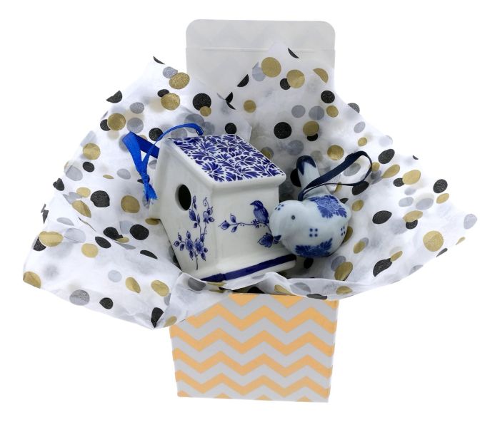 Een Delftsblauw keramieken vogel & een vogelhuisje voor in de kerstboom. Dit product wordt geleverd mooi verpakt in een geschenkdoosje, klaar om te geven!