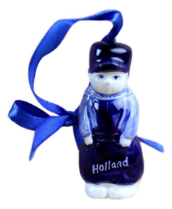 Kermieken kersthanger in het Delfts blauw van een Hollands man in kostuum. De kersthanger is 6.5 cm hoog en heeft een blauw lintje.