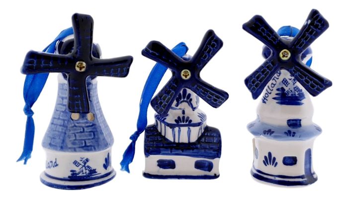 Dit doosje bevat een drietal keramieken Hollandse molen kersthangers in het Delfts blauw.
