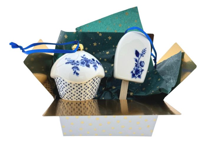 Een leuk kerstgeschenk om te geven. Dit goudkleurige kartonnen doosje bevat twee Delfts blauwe keramieken kersthangers om op te hangen in der kerstboom.