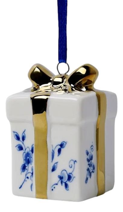 Versier je kerstboom met keramische miniatuurcadeautjes. Dit charmante ornament is vormgegeven als een 3D-presentje, bekroond met een schitterende gouden strik. Hangend aan een sierlijk lintje, is het cadeau verfraaid met Delfts blauwe bloemmotieven aan de zijkanten.