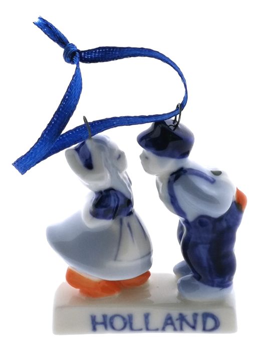Leuke kleine kersthanger van het beroemde kussende paartje in het Delfts blauw, afgewerkt met mooie oranje tulp en een blauw lintje om hem op te hangen.