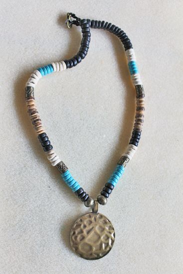 Halsketting met cocos kralen en turkoois kralen, afgewisseld met bronskleurige kralen. De ronde hanger is 4cm in doorsnee, lengte van de ketting is 47cm met 5cm verlengketting.