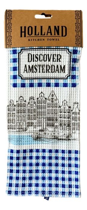 Mooie keukendoek met een Amsterdams tintje. Versierd met molens, tulpen en grachtenhuisjes geeft deze keukendoek een Nederlands tintje aan elke keuken.