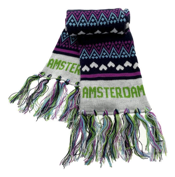 Deze kinder wintersjaal is voor als het koud wordt. Fel paars van kleur en versierd met winterpatronen is deze sjaal ook voorzien van de tekst "Amsterdam".