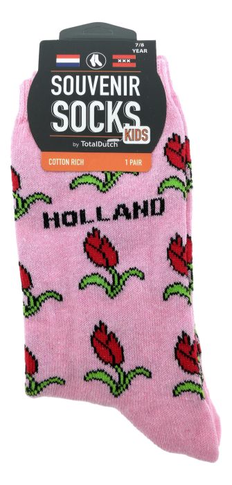 Leuke roze kinder sokken versierd met tulpen en de tekst "Holland". Deze sokken zijn geschikt voor kinderen van ongeveer 7-8 jaar.