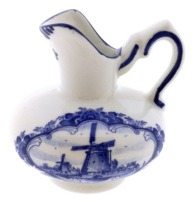 Een klein Hollands keramieken buikvaasje met handvat en versierd met een Hollands molen landschap cartouche.
