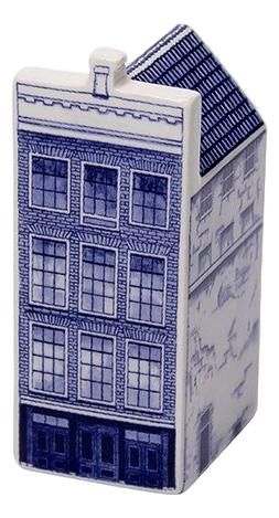 Klein miniatuur keramisch Delfts blauw huisje dat het Anne Frank huis aan de Prinsengracht 263-267 uitbeeld.