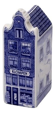 Klein miniatuur keramisch Delfts blauw huisje dat een klompenwinkel afbeeld.