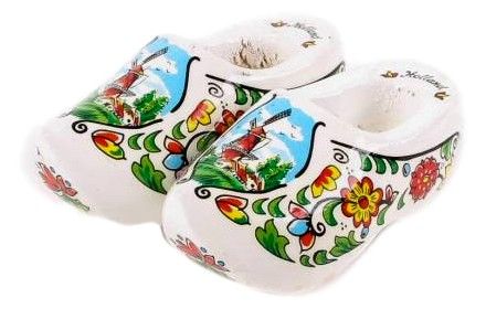 Vrolijke witte dubbele klompjes koelkastmagneet versierd met een molenlandschap op de voorkant en bloemen op de zijkant. Op de wreef staat de tekst "Holland". De klompjes zijn gemaakt van hout en meten 5 cm in lengte. De klompjes zitten vast op een stevige magneet.
